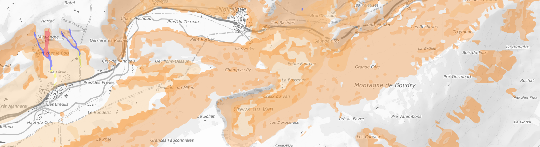 Synthèse du danger occasionné par les glissements superficiels spontanés et les coulées de boue selon 4 degrés de danger : faible, moyen, élevé et résiduel, pour les périmètres ayant fait l’objet d’une étude approfondie. Pour les autres secteurs, la carte indicative indique la situation générale des dangers liés aux différents phénomènes (indifférenciés) de glissements de terrain. Le degré de danger GSS et CB a été établi sur la base de modélisations 2D et 3D et/ou sur la base de méthodes empiriques prenant en compte la pente, la morphologie et les propriétés géologiques du terrain. La carte indicative a été établie sur la base de méthodes empiriques et des relevées géologiques sur le terrain.