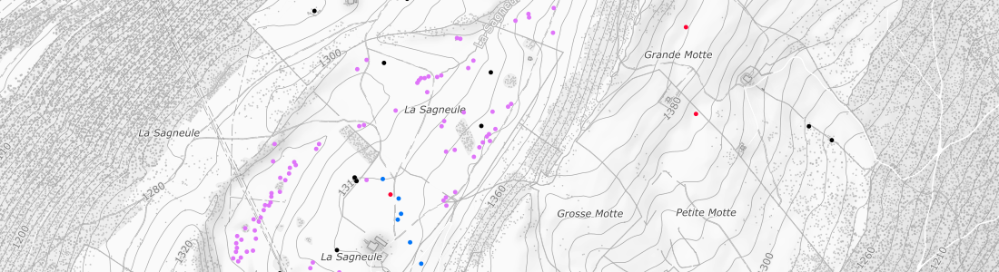 Points représentant des phénomènes d’effondrement karstique (dolines, cavités) inventoriés par (i) la société suisse de spéléologie (SSS/SGH), (ii) le SITN à travers une analyse automatique du MNT1m et une observation de l’ombrage du MNT1m. Les phénomènes sont d’origine stratigraphique et/ou structurale ou indéterminée.