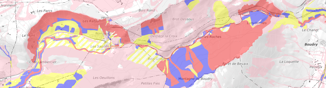La carte de synthèse est une combinaison (superposition) des cartes de dangers naturels et des cartes indicatives de danger, et cela pour chaque thématique (inondations, glissements de terrain, chutes de pierres, éboulements, affaissements, etc.). Le degré de danger (élevé = rouge, bleu = moyen, jaune = faible, jaune hachuré = résiduel) de la carte de synthèse correspond au degré de danger le moins favorable des cartes de chaque thématique.