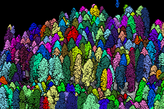 La segmentation consiste à regrouper les points non plus seulement par classe cf. ci-dessus mais par objet, par exemple associé les points végétation à chaque arbre démo sur géoportail du SITN |
